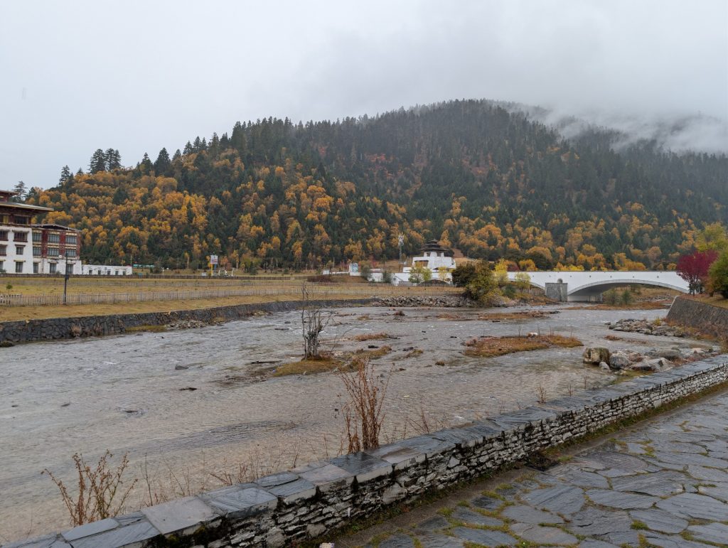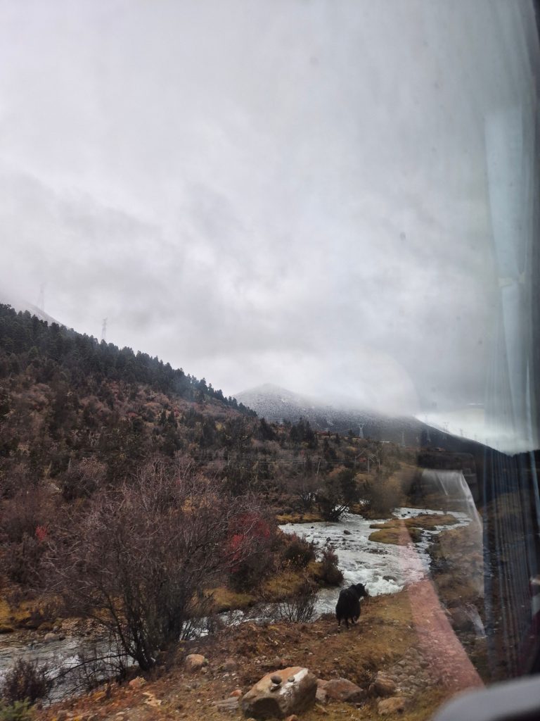 After lunch, we stopped at the Niyang River Valley viewing platform, where the scenery promised a glimpse of a mini Switzerland. Even under grey skies and rain, it was easy to see why. Traditional Tibetan villages nestled at the base of snowy peaks, framed by ancient forests along the riverbanks, with cows and sheep dotting the grasslands. The misty rain added a soft, almost dreamlike layer to the view, and despite the damp, it was still a lovely sight – peaceful and very Tibetan.