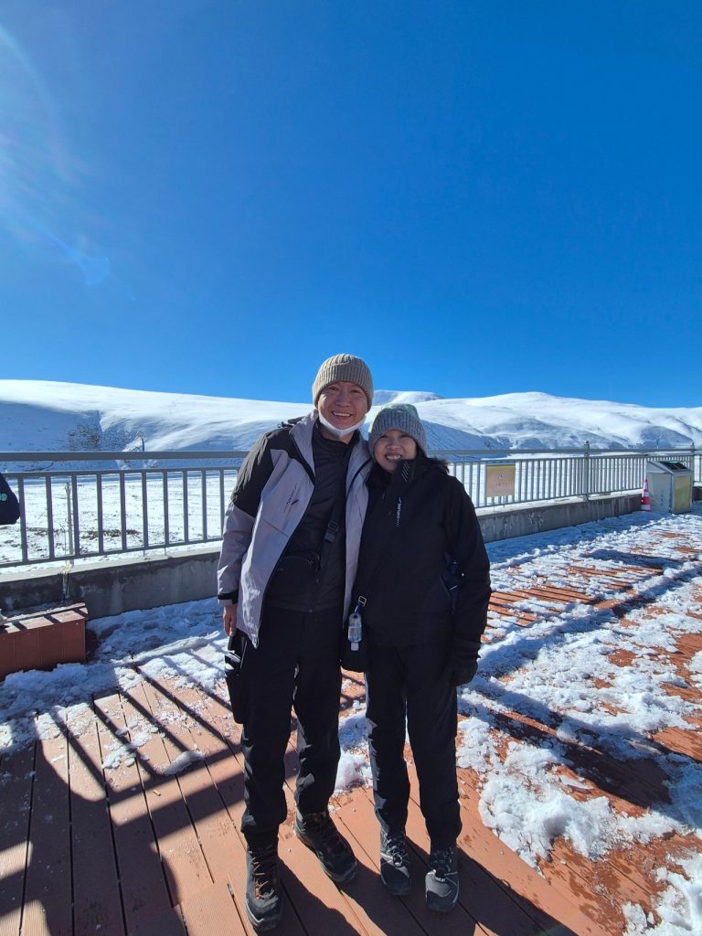 It was freezing cold and extremely windy, but the views were incredible – prayer flags fluttering wildly in the wind, surrounded by endless snow-capped peaks. At this altitude, the air felt noticeably thinner, and we were asked to bring our portable oxygen tanks down from the bus.