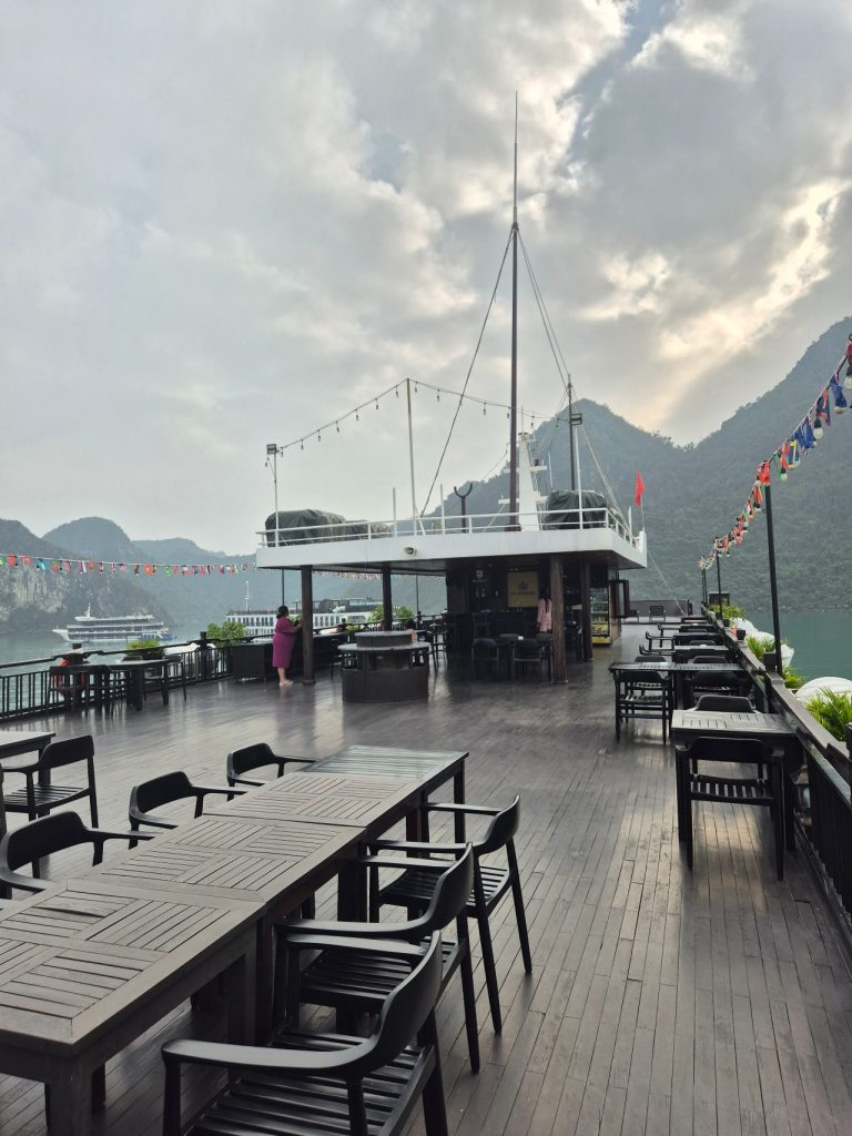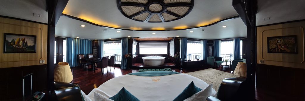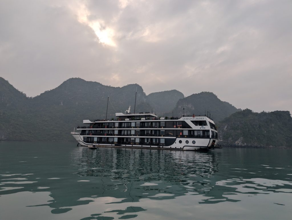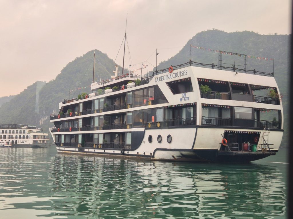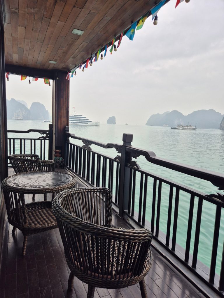 - Cruise Style & Room Type: There are many types of cruise ships and room types to choose from. Do you want the “Old World” charm of a traditional wooden junk boat (like our La Regina Legend) or the sleek look of a modern luxury yacht? Do you want a room with balcony vs without balcony, although I highly recommend booking a room with a balcony so you can watch the limestone karsts from the comfort of your room. Accessibility Tip: If you have mobility issues or are traveling with elderly family members, check if the ship docks directly at the marina. Some ships (like ours) anchor further out which requires a tender boat transfer.