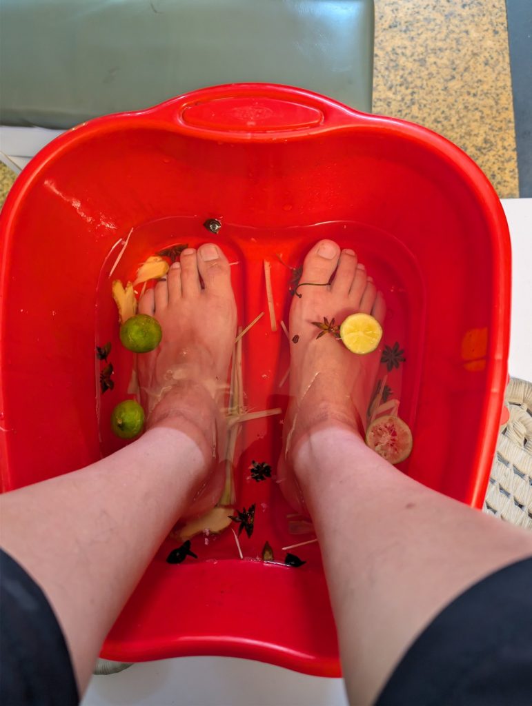 The massage started with a herbal warm foot bath with lime, lemon, lemongrass, anise, and a hot lemongrass tea.