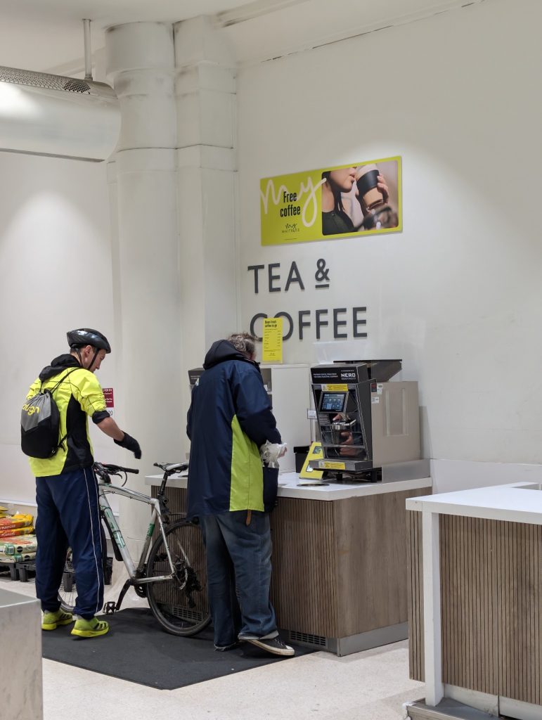 In the morning I think CK went to Emirates Stadium while JX and myself went out for a walk around our neighborhood. Checked out Waitrose and bought some extra instant coffee. Nice place that gives free tea and coffee, we saw the cyclist just come in for the coffee.